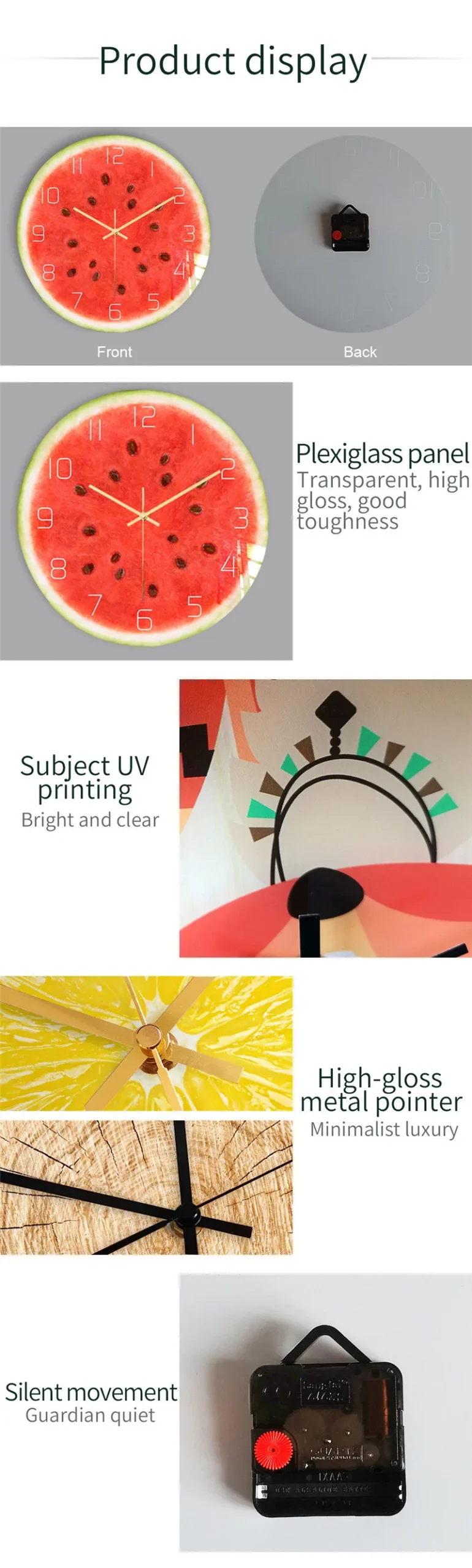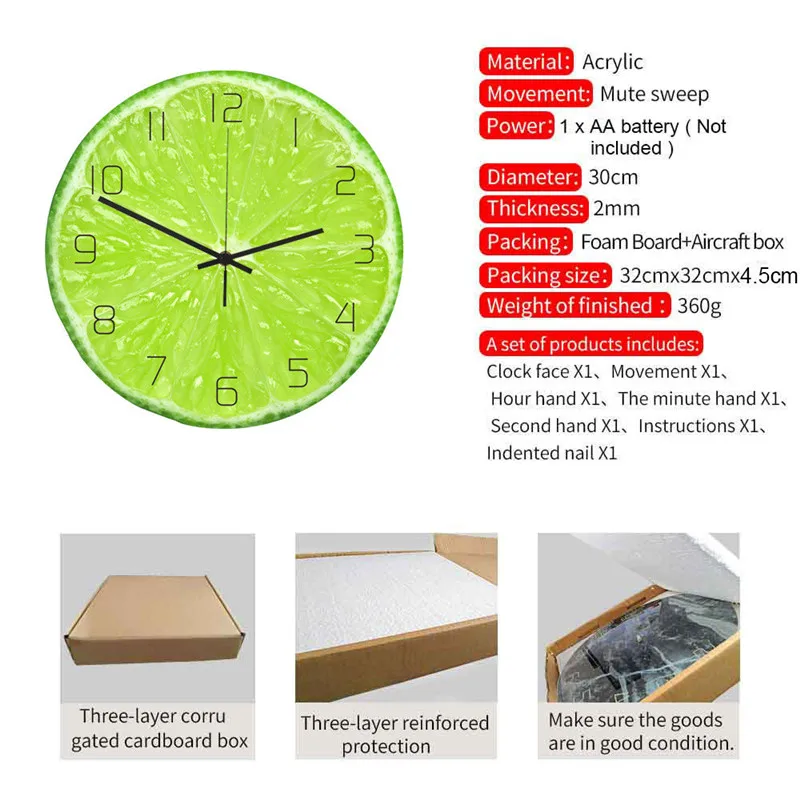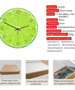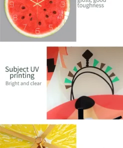Frugt Vægur til Køkken er skabt til både funktion og æstetik. Med en præcis og støjsvag kvartsbevægelse er den perfekt til køkkenets rolige atmosfære, uden afbrydelser fra irriterende tikken. Fremstillet af slidstærke materialer sikrer denne vægur langvarig brug, mens dens kompakte størrelse passer ideelt til vægge i alle størrelser. De livlige farver og frugtmotiver giver et unikt og frisk pust til dit køkkeninteriør, hvilket gør den både praktisk og stilfuld.